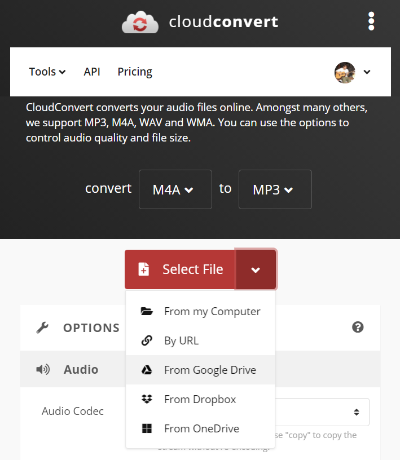 1) Cloudconvert에 구글 드라이브 계정을 등록하면 아래 캡처와 같이 Select File에서 From Google Drive를 선택할 수 있습니다.